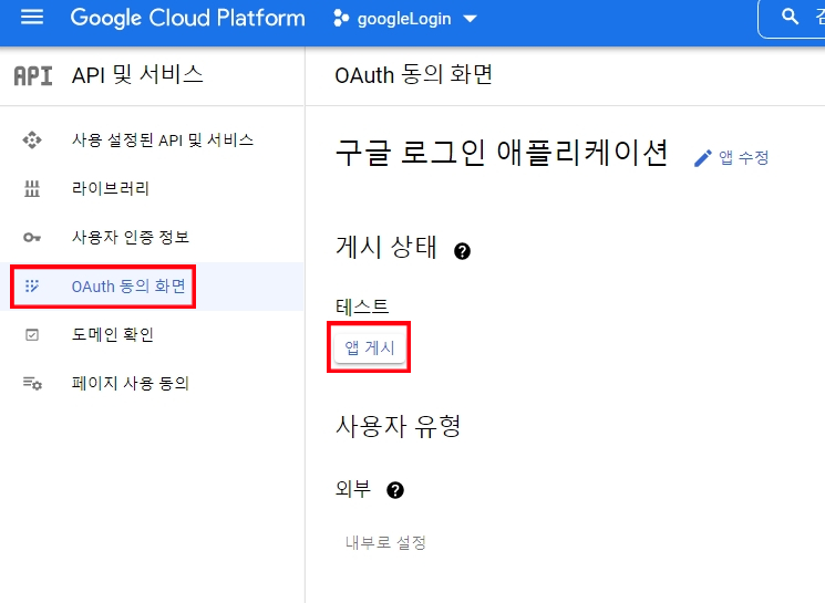 구글 계정을 가진 모든 사용자가 사용할 수 있도록, 외부로 체크하고 만들기 버튼을 누른다.
